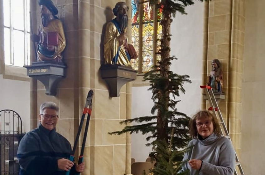 Susanne Kempe und Inge Aldag verpassten dem Weihnachtsbaum, der eben noch in der Kirche so schön gestrahlt hat, eine neue Frisur. Mit Astscheren bewaffnet, stutzten sie ihn so, dass er ...
