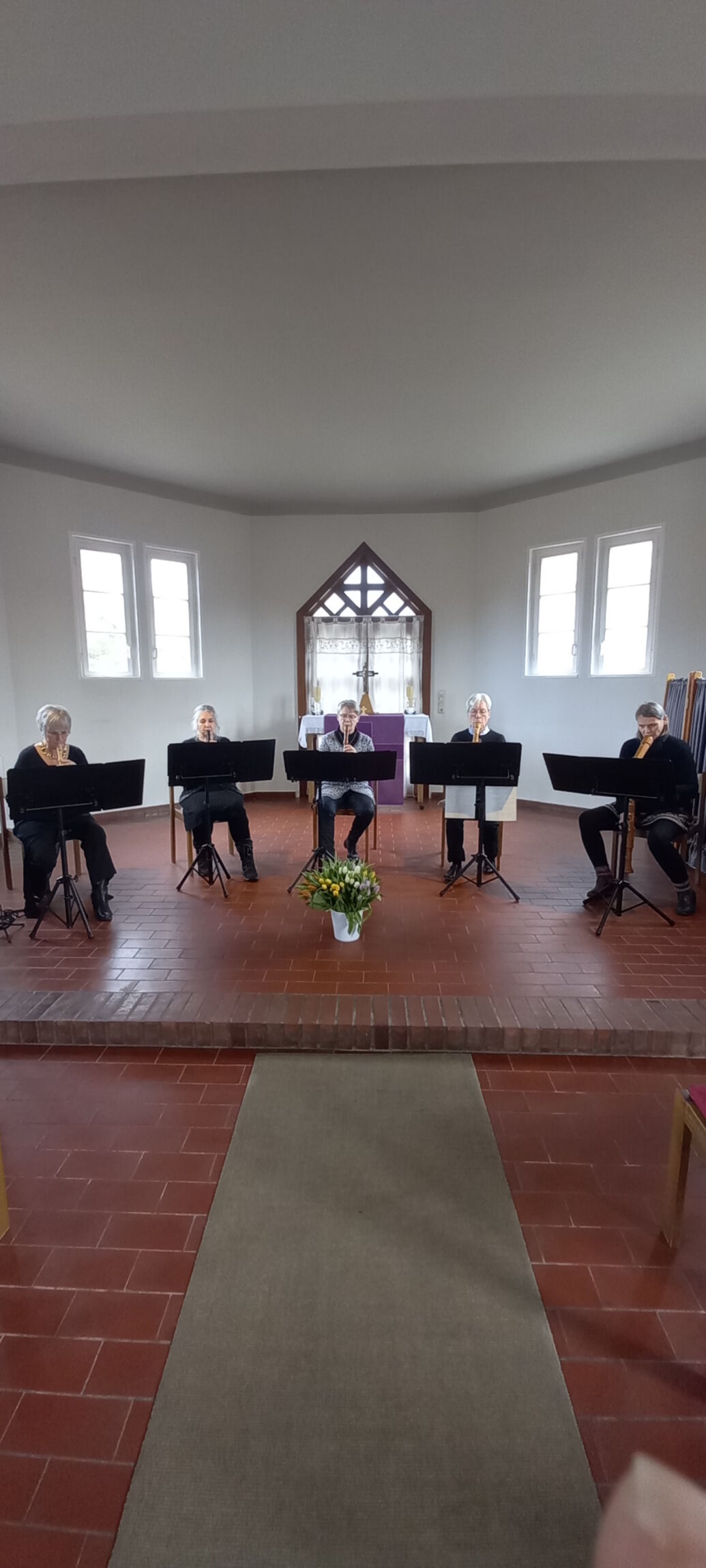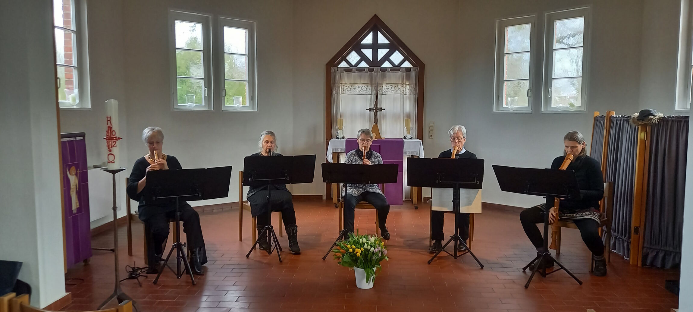 „Als ich neulich die Kapelle auf unserem Friedhof besuchte, war mir schnell klar, dass dieser Kirchraum inmitten des parkähnlichen Friedhofs für unsere Veranstaltung „Musik und Text zur Passion“ der passende Ort sein könnte“. Mit diesen Worten begrüßte Heidrun Heinke, Mitglied das Kirchenvorstandes der Bockenemer Pankratiusgemeinde, die Gäste, die am Sonntagnachmittag in die Friedhofskapelle gekommen waren, um dem Flötenquintett St. Pankratius zu lauschen. Nach der Begrüßung reihte sie sich mit ihrer Blockflöte in das Ensemble ein und überließ der Leiterin des Quintetts Elke Fech die Führung. Die Blockflöten-Lehrerin an der Musikschule Hildesheim spielt im Ensemble die Tenor- und Bassflöte, Kerstine Westphal Tenorflöte, Elgin Schwedeck Altflöte und Heidrun Heinke und Anja Becker Sopranflöten. Es ist bemerkenswert, was das Ensemble in den zwei Jahren seines Bestehens bereits erarbeitet hat. Saubere Intonation, warme Klangbildung und eine gute Kommunikation untereinander ergeben einen sehr guten Gesamtklang. Entsprechend dem Thema des Konzertes waren Choräle aus Passionsmusiken von J. S. Bach das Zentrum des Programms. Deren Texte konnte das Publikum im Programmblatt mitlesen und bedenken. Aber auch Musik von G.F. Händel und Josquin des Près bereicherte die abwechslungsreiche Musikfolge. Einen besonderen Akzent setzte Elke Fech mit dem „Raindance“ der zeitgenössischen Komponistin Nicola Termöhlen (*1979). „Sie werden erleben, wie der Regen allmählich stärker wird, dann ganz heftig ist und sich die Atmosphäre danach allmählich wieder beruhigt. Das kann man auch als Sinnbild für unsere Leben verstehen,“ erklärt die Ensemble-Leiterin das Stück für Solo-Blockflöte. Und dann spielt sie nicht nur ungewöhnliche Flötentöne, sondern muss dazu auch noch gleichzeitig singen. Beides absolviert sie souverän.