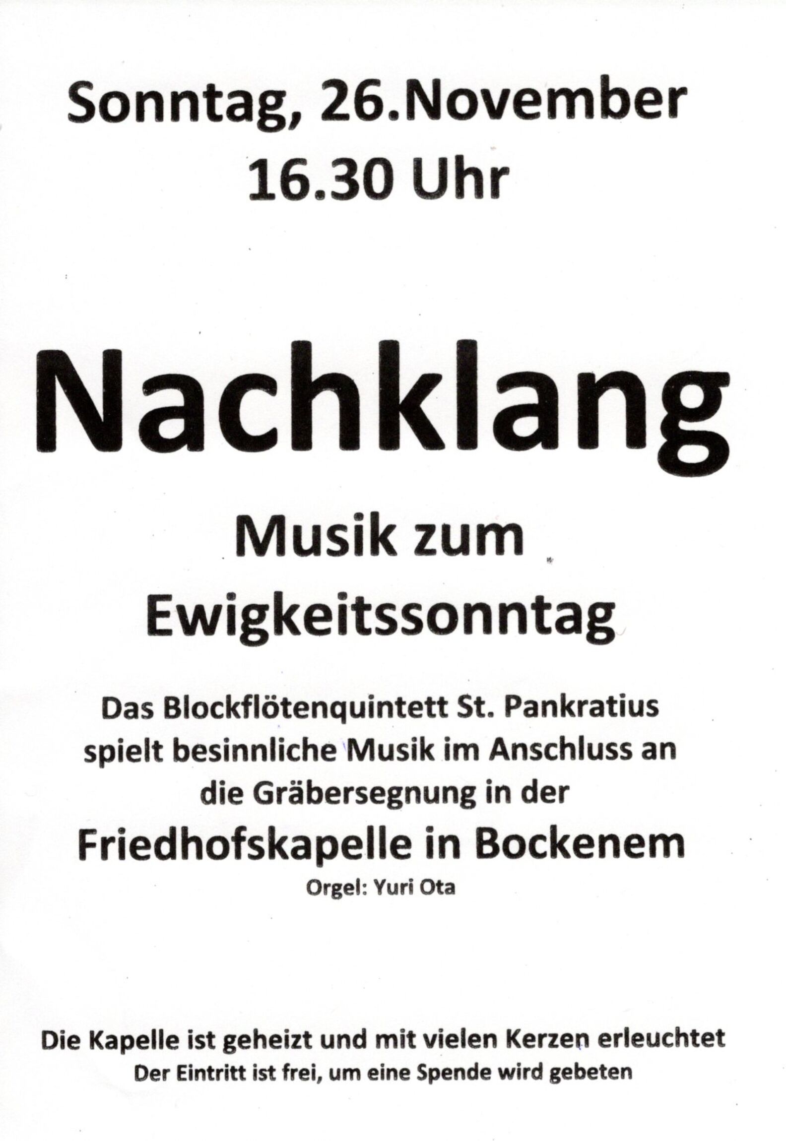 Totensonntag oder Ewigkeitssonntag, wie dieser Tag in der evangelischen Kirche genannt wird, ist ein Gedenktag an die Verstorbenen, aber auch ein Tag, an dem wir über uns und unser Leben nachdenken sollen. Das Blockflötenensemble St. Pankratius hat bereits in der Passionszeit ein besinnliches Konzert mit Musik und Text in der Kapelle gestaltet. Am Ewigkeitssonntag nun lädt das Ensemble erneut zu einer besinnlichen Stunde ein