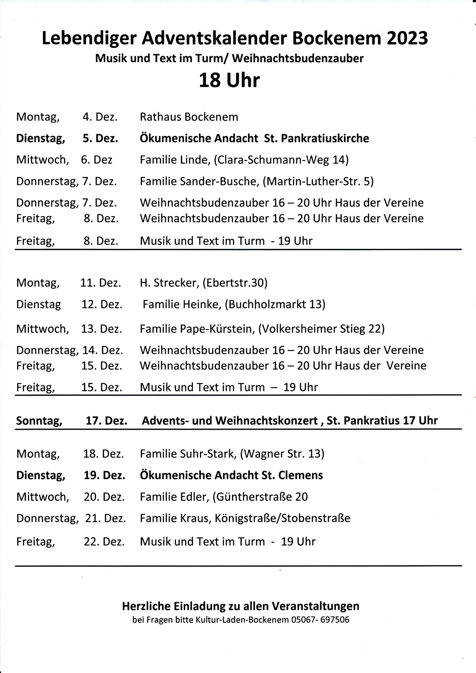 Auch in diesem Jahr treffen sich Menschen in Bockenem zum Singen und Plaudern zum "Lebendigen Advent", zu Musik und Text im Turm und zum Weihnachtsbudenzauber vor dem Haus der Vereine.