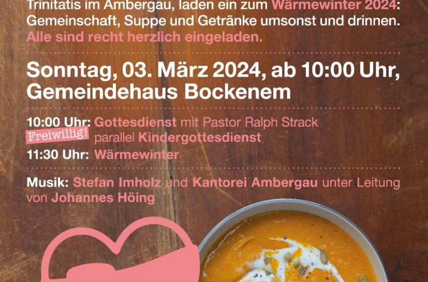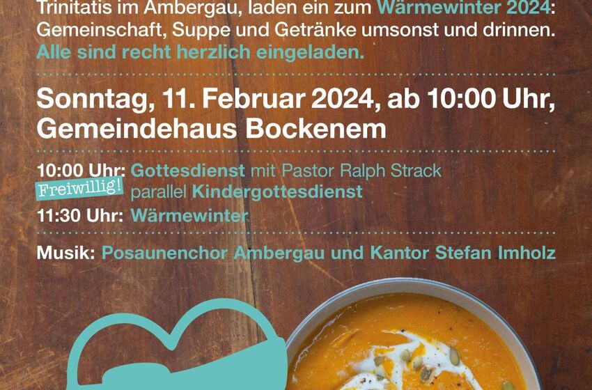 Am kommenden Sonntag, 3. März, findet in Bockenem die 2. Veranstaltung "Suppe und Segen" statt. Das Programm „Suppe und Segen“ gehört zur bundesweiten Kampagne „WärmeWinter“, mit der die ...