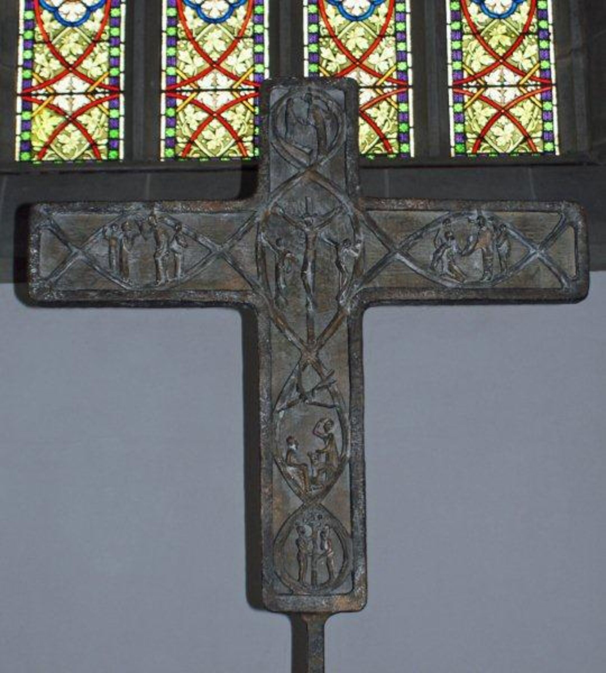 Als unterstes Bild am Längsbalken erkennen wir Adam und Eva im Paradies am Baum der Erkenntnis. Darüber steht, als Bote Gottes, der Erzengel Gabriel, der den Hirten von Bethlehem die Geburt des Heilands verkündet. In der Mitte des Kreuzes, wo Längs- und Querbalken sich treffen, erscheint das Bild der Kreuzigung Jesu. Auch die beiden Räuber, die mit Jesus gekreuzigt wurden, sind hier abgebildet. Auf dem Querbalken ist links die Heilung des Blinden und rechts die Heilung des Lahmen wiedergegeben. Ganz oben im ersten Bild auf dem Längsbalken wird die Totenerweckung dargestellt. Aus diesen Symbolfiguren ergibt sich auf dem Kreuz folgendes Gesamtbild: