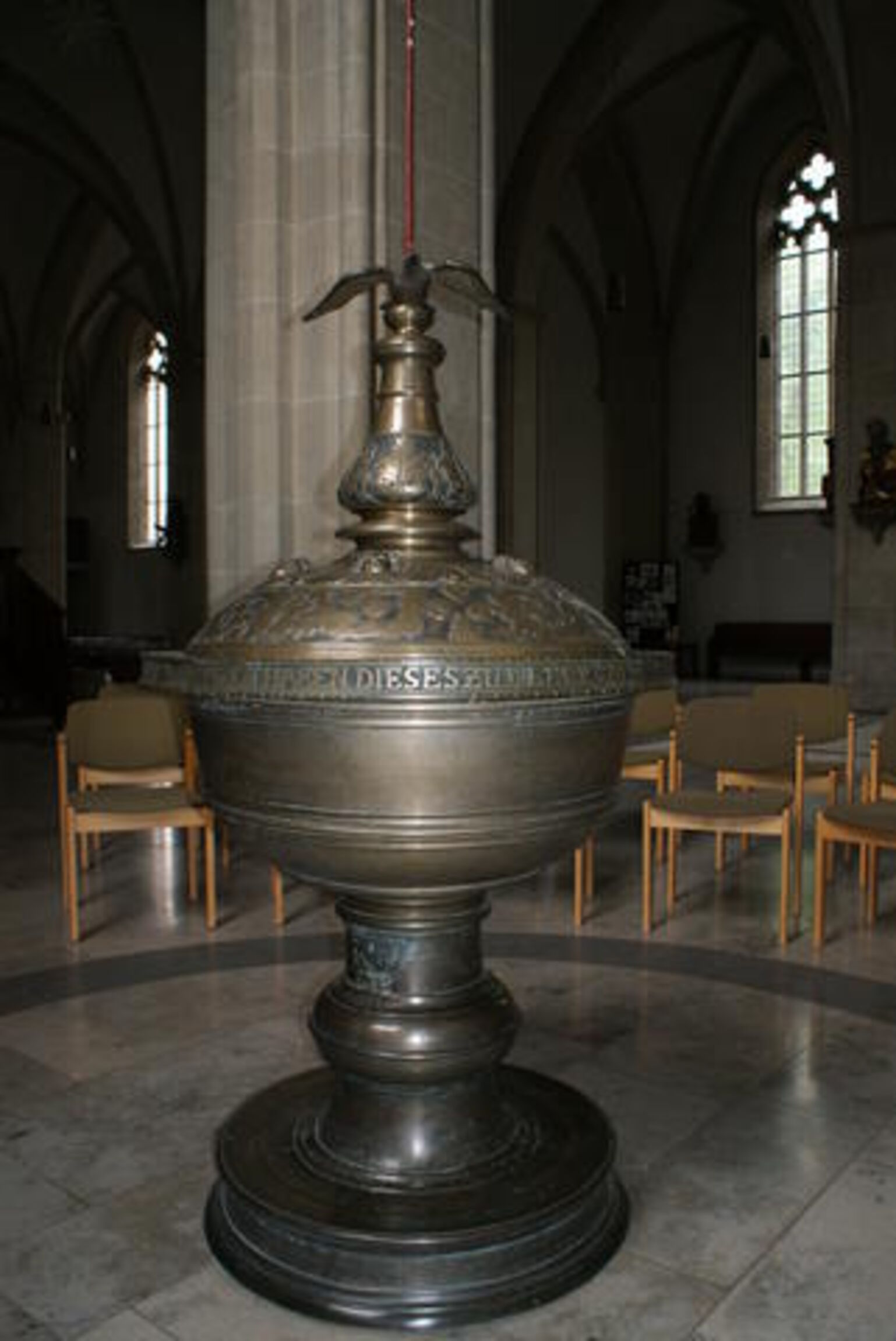 (Übersetzung: Für die gläubigen und ehrsamen Bürger soll diese Glocke, mit Sorgfalt neu gegossen, zu den Gottesdiensten von überall her als Gruß erschallen.).