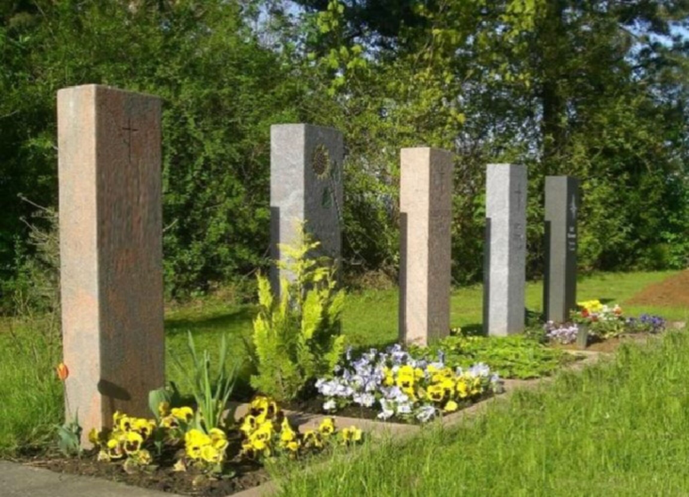 Die Gestaltung hat mit einem stehenden Grabmal (sog. Stele) zu erfolgen, dessen Maß etwa 100 cm Höhe x 60 cm Breite x 15 cm Tiefe beträgt. Das Setzen und die Gründung der Stele sowie die Nachbeschriftung von Namen erfolgen auf Veranlassung und Kosten des Nutzungsberechtigten. Auf dem stehenden Grabmal müssen mindestens der Vor- und Zuname, das Geburts- und das Sterbejahr des bzw. der Verstorbenen enthalten sein.
