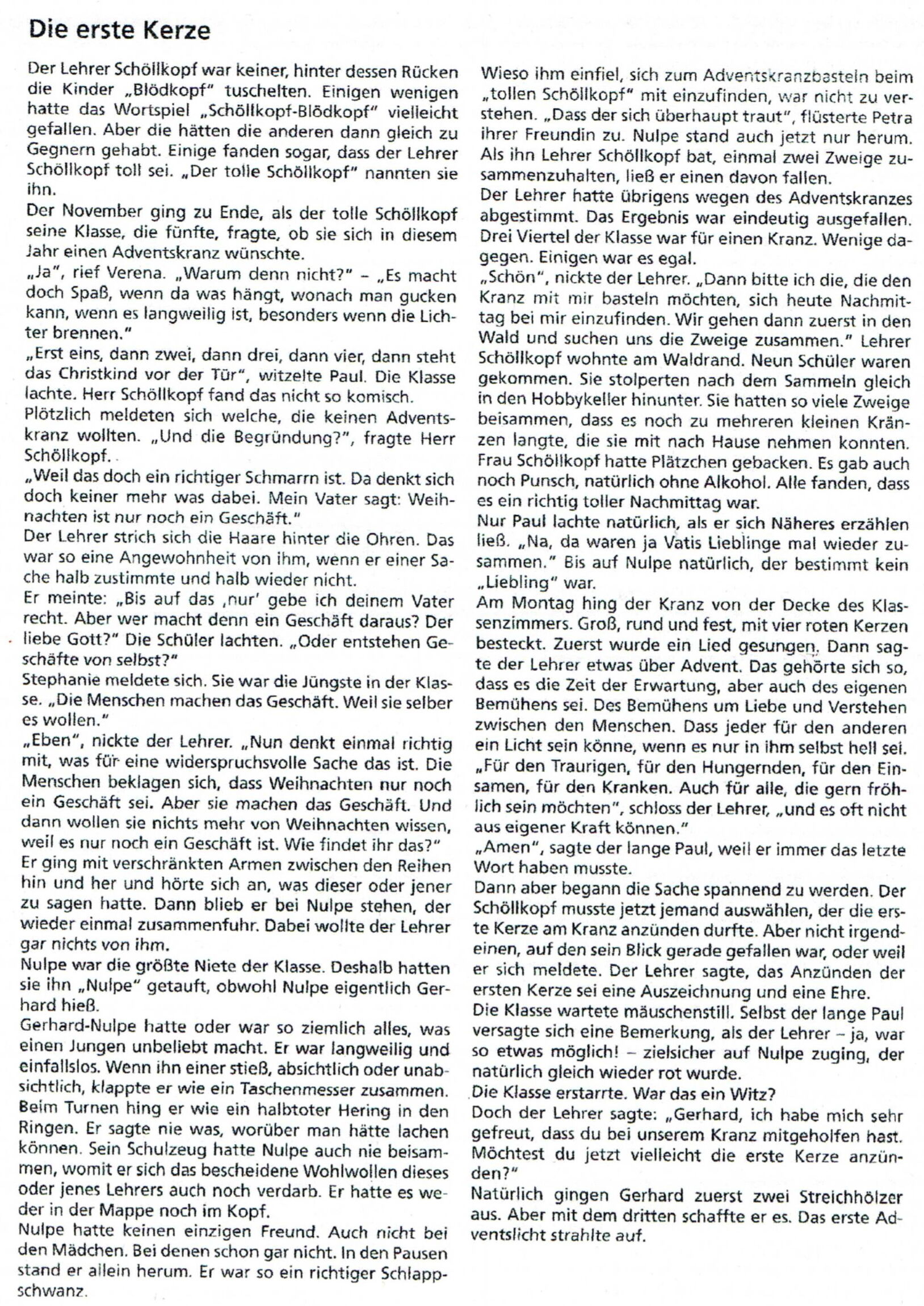 Ich möchte eine Geschichte vorlesen, die eine beispielhafte Antwort gibt. Und weil wir heute die erste Kerze angezündet haben, heißt sie auch „Die erste Kerze“ (aus: Marieluise Bernhard-von Luttitz, Die erste Kerze, in: D.Steinwede u.a. (Hg.); Vorlesebuch Religion 3, Lahr, 1976, S.231ff): …