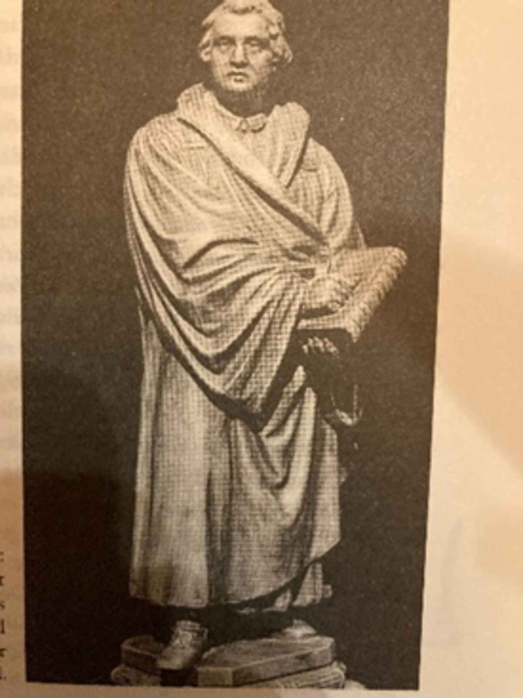 Auf der Fensterbank meines Arbeitszimmers steht … ein unterarmgroßer Blei-Luther, eine Kleinausgabe der Denkmäler, die von der Wende vom 19. zum 20. Jahrhundert an ungezählten Orten in Deutschland aufgestellt wurden: der Reformator als ganzer Kerl, aufrechtes Haupt, vorgestellter rechter Fuß, die Heilige Schrift im starken linken Arm, darauf die rechte Faust. Vorn auf dem Sockel der Spruch: Hier stehe ich, ich kann nicht anders, Gott helfe mir! Amen!“ Und dazu als … Zusatzfunktion: Im Inneren ist eine Spieluhr, die das alte lutherische Kampflied „Ein feste Burg ist unser Gott“ spielt. (163f