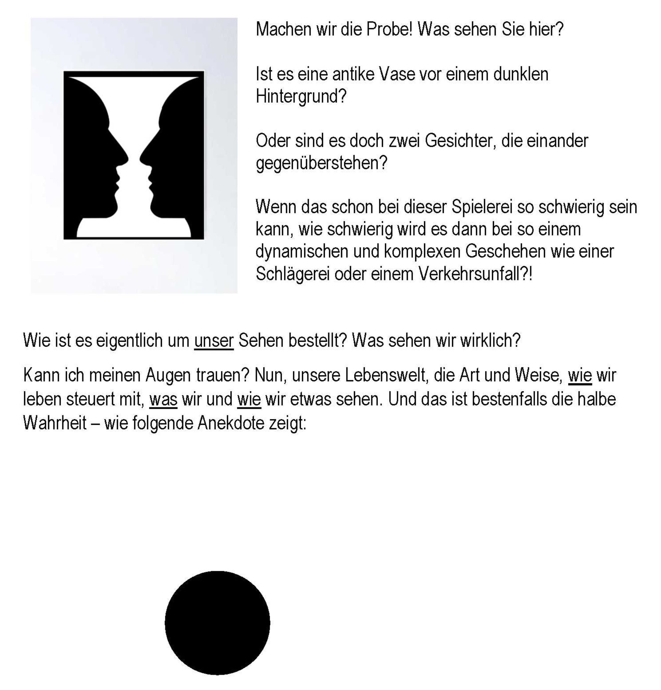 Eines Tages kam ein Professor in seinen Kurs und kündigte einen Überraschungstest an. Er verteilte das Aufgabenblatt, das wie üblich mit dem Text nach unten zeigte. Dann forderte er seine Studenten auf, die Seite umzudrehen und zu beginnen. Zur Überraschung aller gab es keine Fragen – nur einen schwarzen Punkt in der Mitte der Seite. Nun erklärte der Professor: „Ich möchte Sie bitten, das aufzuschreiben, was Sie dort sehen Am Ende der Stunde sammelte der Professor alle Antworten ein und las sie vor. Alle Schüler hatten den schwarzen Punkt beschrieben – seine Position in der Mitte des Blattes, seine Lage im Raum, sein Größenverhältnis zum Papier usw.