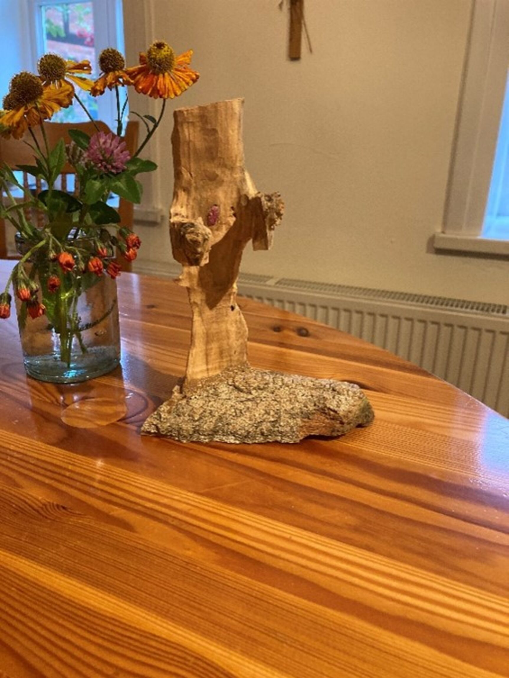 Darauf zu sehen war ein Christus, der sich vom Kreuz herabbeugt und einer Schar von Kindern seine Hand hinhält. Eines berührt mit dem Mund seine Hand.