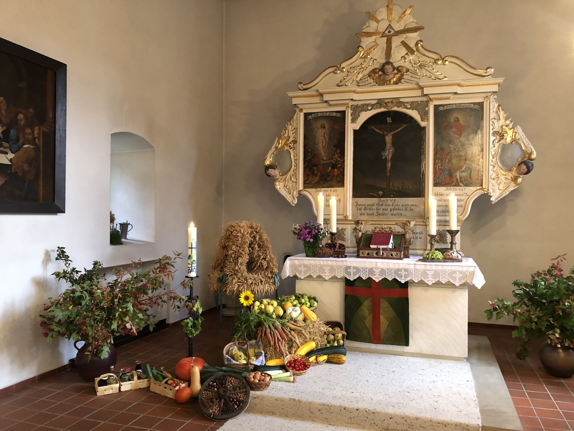 Wie auf dem Bild links zu sehen ist, war die Ernte in den Königsdahlumer Gärten wieder einmal reichlich! Da gab es zum Erntedankfest allen Grund, dankbar zu sein. Damit aber nicht nur der Magen gesättigt wird, hatten die Besucher/innen von 5nach6 die Erntegaben vorab auch noch ansprechend vor dem Altar aufgebaut, so dass auch die Augen ihre helle Freude hatten. Natürlich duften auch Brot und Wein (rechts auf dem Altar) nicht fehlen, wobei Pastor Strack in seiner Predigt darauf einging, dass der Mensch nicht allein vom Brot lebt.