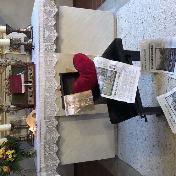 Nach der griechischen Sage ist nämlich in der Büchse der Pandora auch die Hoffnung verborgen. Dazu passt die doppelte Botschaft des Kreuzes, nämlich sich einerseits dem Übel zu stellen und andererseits auf die Kraft der Auferweckung durch die Liebe Gottes zu setzen. Da passte das rote Herzkissen gerade recht.