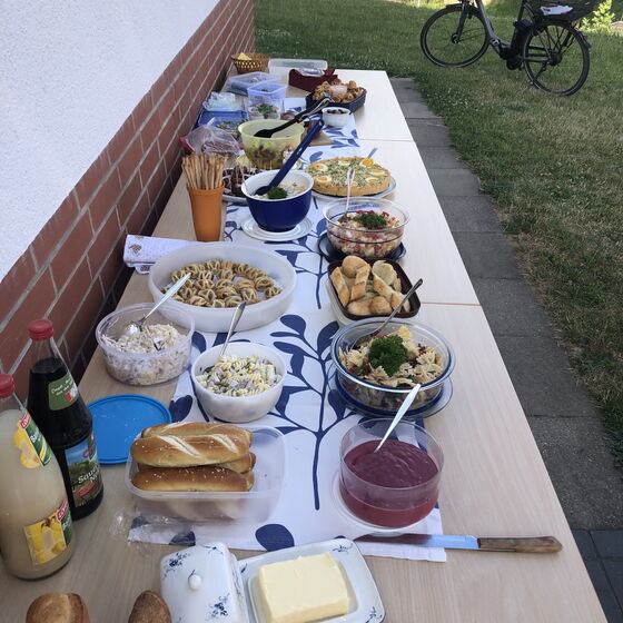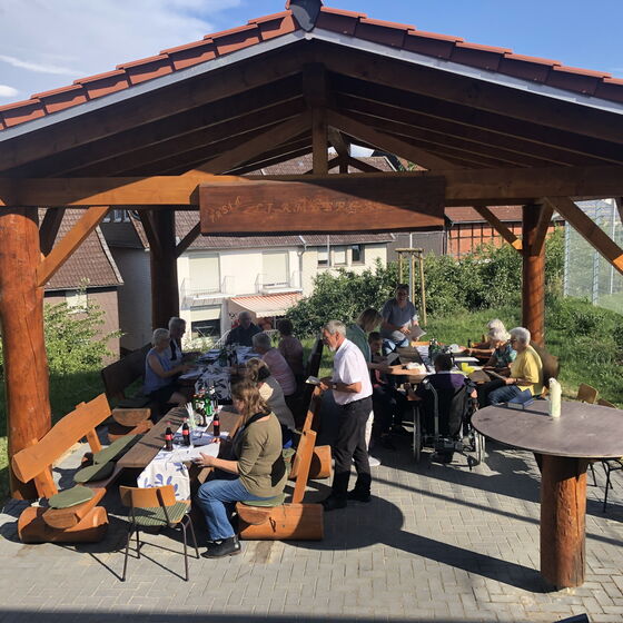 Weil es die erste Gemeindeveranstaltung „ohne Gemeindehaus“ war (und das Wetter allen Unkenrufen zum Trotz gut blieb), konnten wir „Beten, Singen und Buffet“ erstmals in der Wanderhütte am DGH genießen, wo zukünftig weitere Veranstaltungen stattfinden können. Ein unüberhörbares und gelungenes Lebenszeichen und Geschenk nach der Corona-Zwangspause