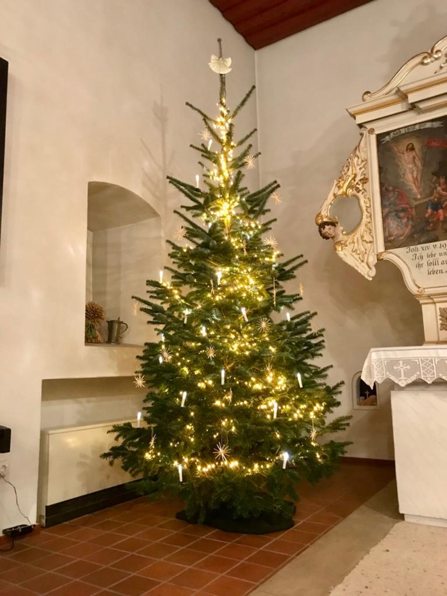 Jens und Ella Fischer bringen einen sehr schönen Christbaum aus Wohlenhausen. Zusammen mit Ellen Lippel, unserer Küsterin, stellen sie ihn auf. Stephanie und Justus Gropp helfen unserer Küsterin, die Beleuchtung zu drapieren. Das Ende der Arbeit ist ein erster Anfang von Weihnachten in St. Johannis.